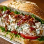 A delightful sandwich combining tender chopped chicken, crispy bacon, and creamy ranch dressing, all nestled in a fresh baguette.