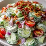 This salad isn’t just delicious; it embodies the essence of effortless cooking and casual gatherings. Imagine the way guests’ eyes light up as you reveal this fresh creation, exuding freshness and a tempting aroma. The creamy ranch dressing binds together the crisp cucumbers, juicy tomatoes, and crunchy bacon, creating an experience that’s both satisfying and soul-soothing.