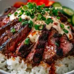 Now, it’s assembly time! Place a generous scoop of rice at the bottom of each serving bowl. Layer the sliced steak on top, shining with flavor from the marinade, and then drizzle with the spicy cream sauce that brings it all together.