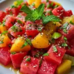 A refreshing summer salad featuring juicy peaches and crisp watermelon, drizzled with honey and lime, and enhanced with fresh mint.