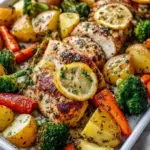 A delightful one-pan meal featuring juicy chicken marinated in zesty lemon and fragrant herbs, alongside roasted golden potatoes, sweet carrots, and vibrant broccoli.